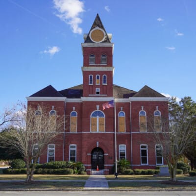 Built in 1902-03, the Wayne County Courthouse is a Romanesque Revival landmark designed by architect S.A. Baker. The cross-planned, two-story brick building features a prominent clock tower with an open belfry and remains a defining feature of Jesup’s courthouse square. Listed individually in the National Register of Historic Places, the courthouse has long served as the center of county government. Interior restorations in the late 20th century preserved original layouts and significant woodwork, including the historic second-floor courtroom.Â