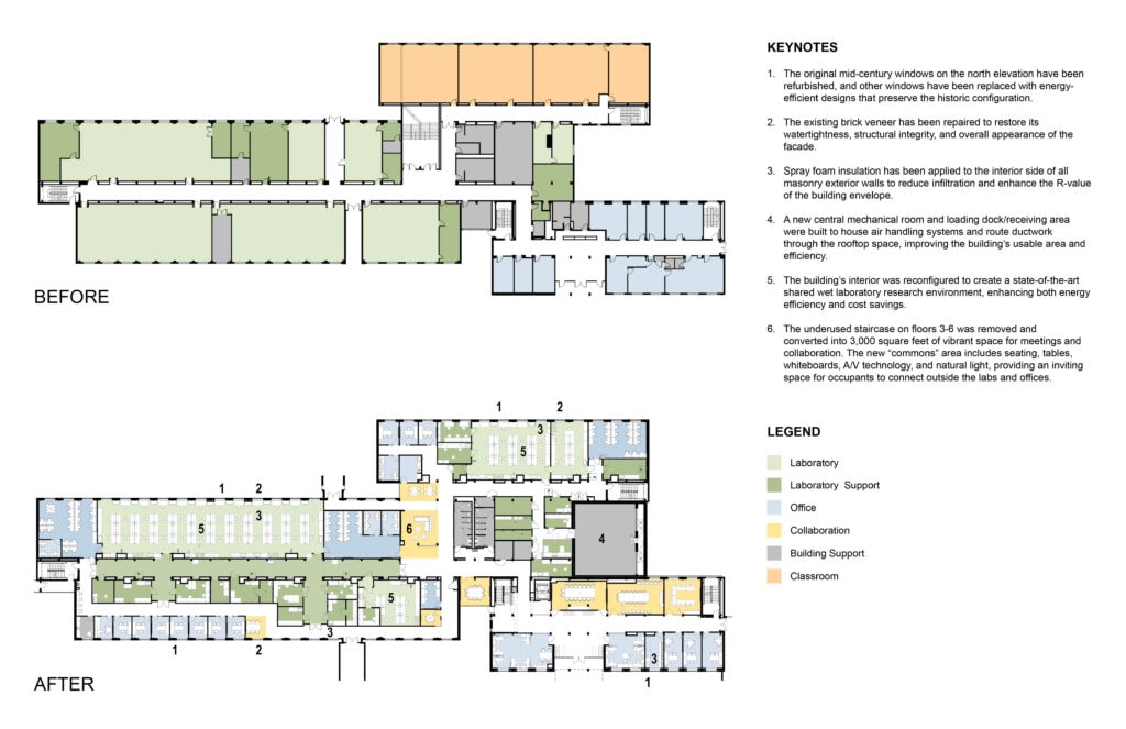The University of Georgia’s former Chemistry Building was constructed in 1960 as part of a larger Science Center development on the campus. The design represents the Space-Race-era vision for academic and scientific architecture. Through a $47 million rehabilitation the building was transformed into a state-of-the-art facility for interdisciplinary scientific research. Roofing and mechanical systems were replaced, original windows were restored or replaced with energy-efficient units, and brick veneer was repaired. Many efforts were taken to improve air quality and energy efficiency of the building while retaining historic character. This project demonstrates how aging research buildings can be sustainably modernized for today’s needs while preserving architectural integrity, even while meeting strict scientific standards. As the first phase in UGA’s long-term Science and Ag Hill revitalization plan, it sets a precedent for responsible reuse of historic academic infrastructure.
